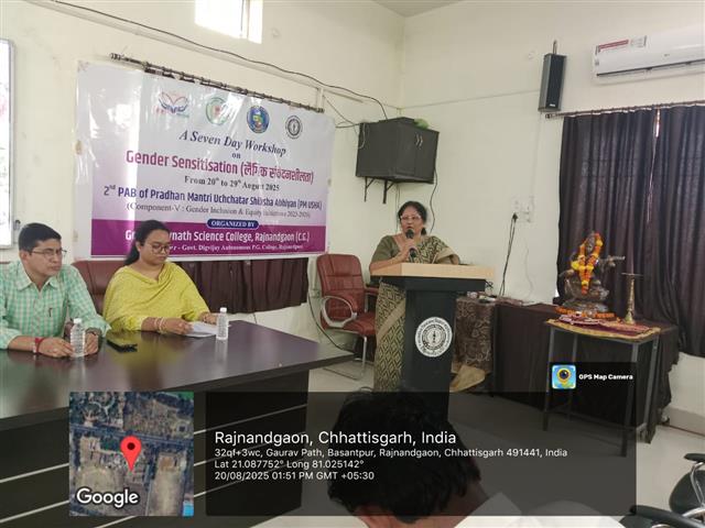 शासकीय शिवनाथ विज्ञान महाविद्यालय के तत्वाधान में पीएम उषा के तहत "लिंग समावेशन और समानता पहल" विषय के अंतर्गत लैंगिक संवेदनशीलता पर दिनांक 20- 8-2025 से 29- 8 -2025 तक सात दिवसीय कार्यशाला का शुभारंभ किया गया। मां सरस्वती के समक्ष दीप प्रज्वलन कर इस कार्यक्रम का श्रीगणेश किया गया। इस कार्यक्रम के संयोजक डॉ. ए. एन. माखीजा, कार्यक्रम का संचालन महाविद्यालय के प्राध्यापक पुण्यप्रदा सिंह (अंग्रेजी विभाग) ने किया और कहा कि लैंगिक संवेदनशीलता महिला को पुरुष के विरुद्ध सोच पैदा करने में नहीं अपितु शिक्षा में जागरूकता पैदा कर समता और समरसता विकसित करनें में है।