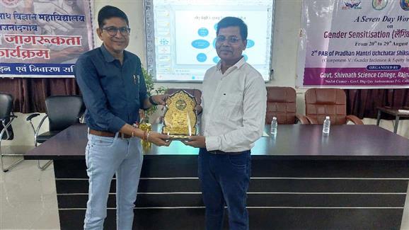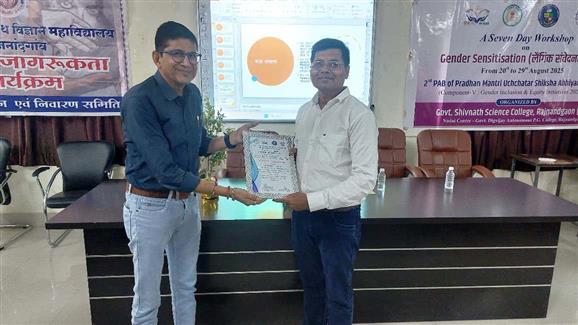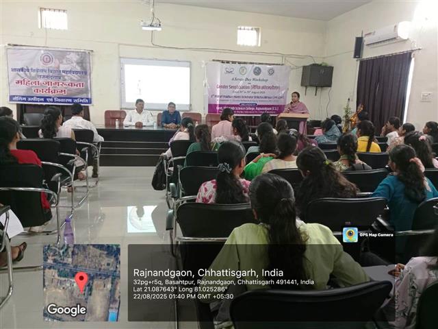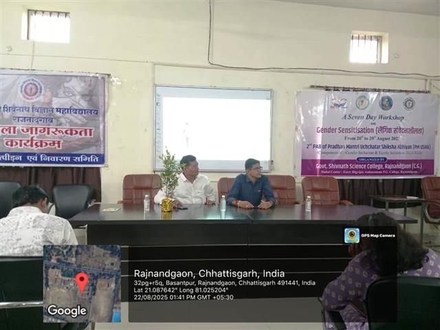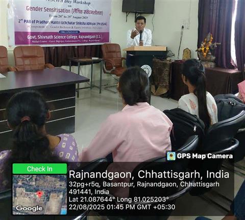 शासकीय शिवनाथ विज्ञान महाविद्यालय में तृतीय दिवस की कार्यशाला दिनांक 22-08-2025 को संपन्न हुआ। जिसमें बतौर विषय विशेषज्ञ श्री चंद्रकिशोर लाड़े (जिला बाल संरक्षण अधिकारी राजनांदगाँव )ने "बाल अधिकार तथा लैंगिक अपराधों से संरक्षण"सम्बन्धी विषय पर छात्रों को बाल शोषण, बाल असुरक्षा और बाल संरक्षण आदि के बारे में अवगत कराते हुए कहा कि बाल शोषण आज एक गंभीर समस्या बनी हुई है जिसमें बच्चों के अधिकारों का हनन होता है उन्हें शारीरिक, मानसिक या भावनात्मक नुकसान पहुँचाया जाता है भिक्षावृत्ति, दहेज, बालश्रम, मानव तस्करी, अपने विचार व्यक्त न करने देना, धमकी देना, कुपोषण का शिकार जैसे बाल दुर्व्यवहार समस्याओं की भी चर्चा छात्रों से करते हुए कहा कि इसके लिए हर बेटी को बदलना होगा, स्वयं में बदलाव लाना होगा, दूसरों की बेटी को अपना मानना होगा,समाज में सहभागिता का अधिकार स्थापित करना होगा तभी हम इस भयानक खतरों से निजात पाएंगे। इसके प्रभाव को विस्तार से बताते हुए कहा कि इससे बच्चों को शारीरिक नुकसान पहुँच सकता है, जैसे चोटें या अन्य शारीरिक समस्याएं,मानसिक समस्याएं उत्पन्न हो सकती हैं, अवसाद, चिंता या आत्महत्या के विचार भी उत्पन्न होने लगते हैं।इसके संरक्षण के अनेक आयामों को बताते हुए कहा कि बालिकाओं में जागरूकता फैलाना और लोगों को इसके प्रभावों के बारे में शिक्षित करना अत्यंत आवश्यक है। उन्हें सुरक्षित वातावरण प्रदान करना और उनकी देखभाल करना हमारी जिम्मेदारी है।ऐसे बालिकाओं की सहायता प्रदान करना चाहिए जैसे बीच बीच में परामर्श या चिकित्सा देखभाल आदि। इसके अतिरिक्त सोशल मीडिया के प्रभाव और इसके रोकथामों पर भी विस्तार से वर्णन किया।समाज में हुए घटनाओं को बताकर छात्रों में जागरूकता लाने की बात भी अपने वक्तव्य में कहा।