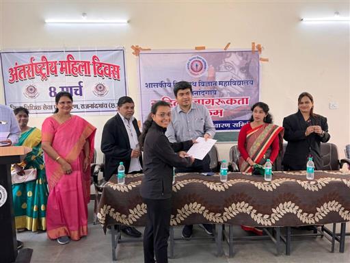 राजनांदगांव। दिनांक 08.03.2022 को शासकीय शिवनाथ विज्ञान महाविद्यालय राजनांदगांव में प्राचार्य डॉ. निर्मला उमरे के मार्गदर्शन में, महिला प्रकोष्ठ की संयोजक डॉ. नागरत्ना गनवीर के नेतृत्व में अंतर्राष्ट्रीय महिला दिवस कार्यक्रम का आयोजन किया गया। कार्यक्रम की मुख्य अतिथि वक्ता आदरणीय श्री देवाशीष ठाकुर, न्यायाधीश एवं सचिव जिला विधिक सेवा प्राधिकरण, राजनांदगांव, विशेष अतिथि वक्ता, श्रीमती प्रिया कांकरिया, अधिवक्ता राजनांदगांव, श्री राजेश चंदेल सीनियर अधिवक्ता, राजनांदगांव एवं कार्यक्रम की अध्यक्षता महाविद्यालय की जनभागीदारी समिति अध्यक्ष, श्रीमती प्रज्ञा पंकज गुप्ता ने की।