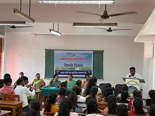 इस अवसर पर संस्था प्राचार्य डॉ. (श्रीमती) सुमन सिंह बघेल ने संबोधित करते हुए कहा कि भाषा अभिव्यक्ति की सशक्त माध्यम है, राजभाषा हिन्दी हमारी राष्ट्रीय एकता की पहचान है। हम सबको इसे व्यवहार में लाने की आवश्यकता है। डॉ. निर्मला उमरे ने कहा कि हिन्दी भाषा संसद से सड़क तक, कश्मीर से कन्याकुमारी तक, साहित्य, सिनेमा, मीडिया मंे फैली हुई है। डॉ. नागरत्ना गनवीर ने हिन्दी को सेतु भाषा की संज्ञा दी। जो भारतीय जनमानस को जोड़कर रखे हुए है। हिन्दी दिवस के अवसर पर महाविद्यालय में ओपन क्वींज प्रतियोगिता का संचालन करते हुए श्री कपिल सूर्यवंशी ने विद्यार्थियों से हिन्दी विषय पर प्रश्न पूछे, जिसके विजेता छात्र/छात्राओं प्रफुल्लिता कोसरिया, देविका मेश्राम, चेतनपाल, पुष्पेन्द्र साहू, वर्षा अग्रवानी, लोमन पाल, तुषार कुमार, कनिषा शर्मा, नीरज प्रसाद, सागर, पुष्कर साहू, सावित्री साहू, संतोषी सिन्हा, मोनिका वर्मा, विरेश साहू को संस्था प्राचार्य द्वारा पुरस्कृत किया गया।
