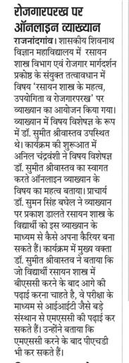 राजनांदगांव। शासकीय शिवनाथ विज्ञान महाविद्यालय राजनांदगांव में दिनांक 20.06.2022 को महाविद्यालय के रसायनशास्त्र विभाग एवं रोजगार मार्गदर्शन प्रकोष्ठ के संयुक्त तत्वाधान में विषय ‘रसायनशास्त्र के महत्व, उपयोगिता व रोजगार परख’ पर व्याख्यान का आयोजन किया गया। इस व्याख्यान में विषय विशेषज्ञ के रूप में डॉ. सुमीत श्रीवास्तव, सहायक प्राध्यापक रसायनशास्त्र, शासकीय स्वामी आत्मानंद स्नातकोत्तर महाविद्यालय, नारायणपुर (छ.ग.) उपस्थित थे। कार्यक्रम की शुरूआत में रोजगार मार्गदर्शन प्रकोष्ठ के संयोजक श्री अनिल चन्द्रवंशी, सहायक प्राध्यापक वाणिज्य ने विषय विशेषज्ञ डॉ. सुमीत श्रीवास्तव जी का स्वागत करते हुए आज के इस ऑनलाईन व्याख्यान के विषय का महत्व बताते हुए महाविद्यालय के प्राचार्य डॉ. सुमन सिंह बघेल को विद्यार्थियों को संबोधन के लिए आमंत्रित किये। प्राचार्य महोदया ने इस व्याख्यान के महत्व पर प्रकाश डालते हुए रसायनशास्त्र के विद्यार्थी इस व्याख्यान के माध्यम से कैसे अपना कैरियर बना सकते है तथा विद्यार्थियों को अपने संबोधन में कहा कि रसायनशास्त्र में एम.एससी. करने के बाद सरकारी एवं गैरसरकारी संस्थान जैसे- फर्मा कंपनी, एन.टी.पी.सी., कोचिंग संस्थानों में अपनी सेवाएं दे सकते है।